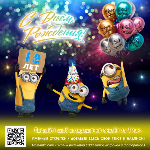 Готово! Скачайте готовую открытку с 12-летием и отправьте её имениннику, чтобы порадовать его персональным эксклюзивным поздравлением.