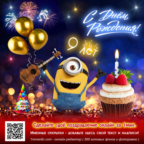 Выберите из нашего альбома уникальную открытку на 9 лет ребенку и сделайте их персональными! С помощью IT-технологии, Вы сможете создать открытку, которая будет отличаться от стандартных вариантов и запомнится имениннику.