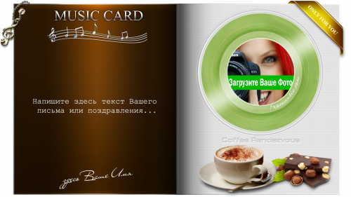 Прекрасный и оригинальный способ приглашения на чашку кофе с помощью одноимённой музыкальной открытки. Будьте уверены, что после такого нестандартного приглашения, Вам вряд ли кто откажет. Напишите своё имя и нужные слова, добавьте свою фотографию и подходящую для этого случая песню или мелодию. Желаем Вам удачи! Ждём Ваших комментариев, нам будет очень интересно.